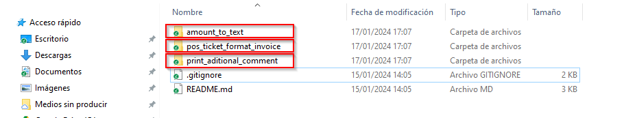 Al descargar y descomprimir el archivo comprimido, se verán una o más carpeta y cada una de ellas contiene un módulo, en el siguiente ejemplo, se visualizan tres carpetas que representan tres módulos: