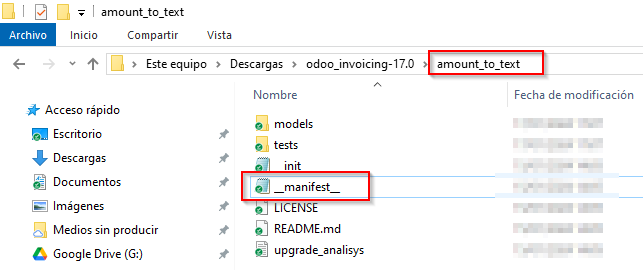 Como encuentro un archivo llamado "__manifest__", significa que esa es la carpeta (amount_to_text) que contiene el módulo y que debo copiar el directorio creado en el PASO 1 anterior, como se explica en el siguiente PASO 3.