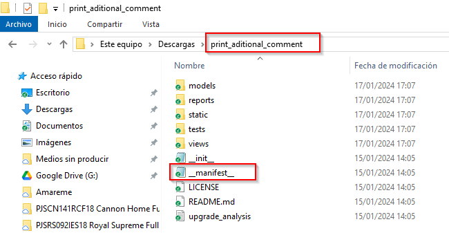 Por ejemplo, si recibes un comprimido (.zip o .rar) que al descomprimir te muestra una carpeta y no estás seguro si el módulo es esa carpeta o las carpetas que están adentro, solo debes verificar en qué carpeta está el archivo "__manifest__"