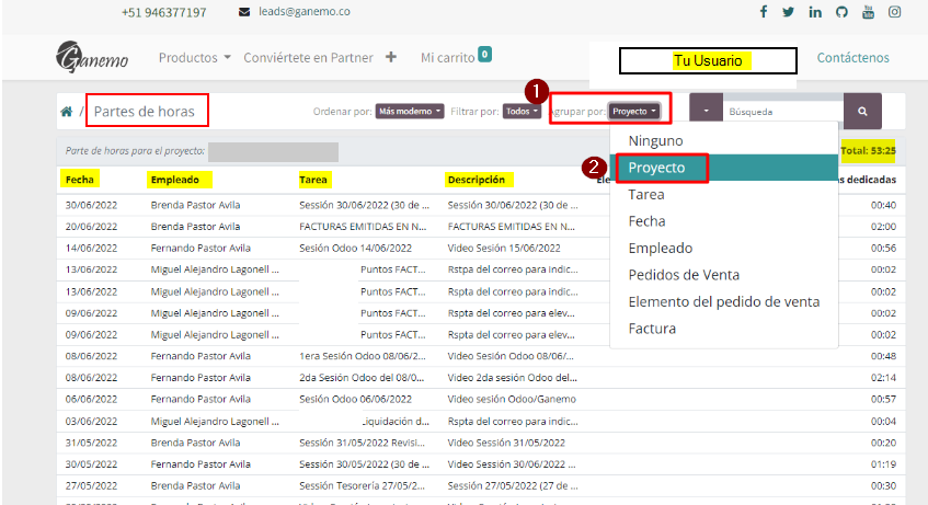 "Parte de Horas" y tendrás la vista de tus tareas en el proyecto vigente, para tener mayor visibilidad de tus tickets y horas consumidas te recomendamos: