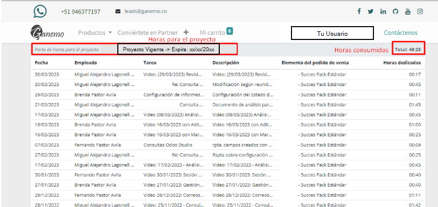- De esta manera se visualizará las horas del proyecto vigente con la fecha de expiración del mismo y en la parte superior derecha se mostrará las horas consumidas a la fecha.