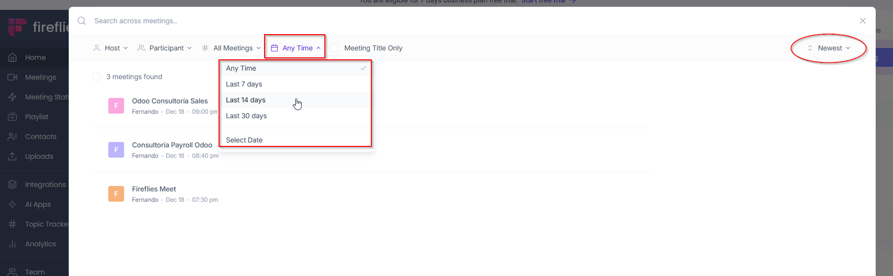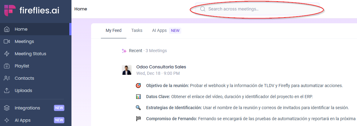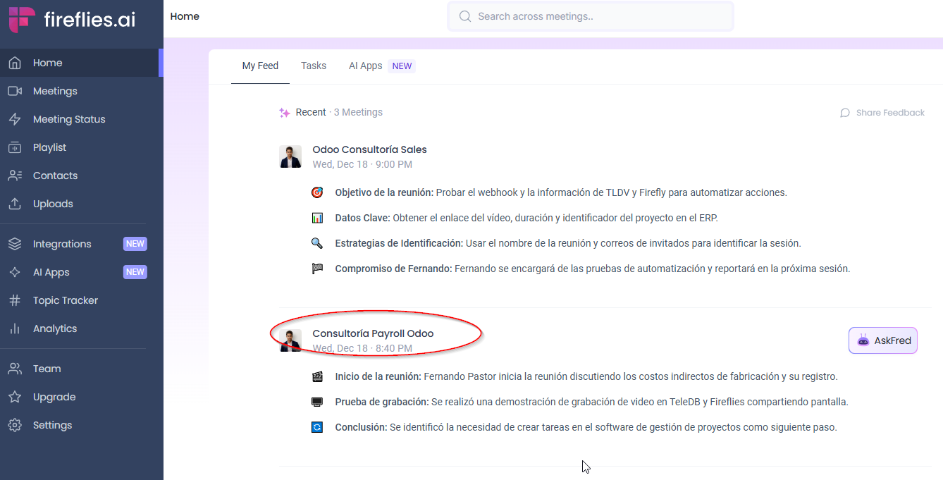 Pueden aprovechar las herramienta de inteligencia artificial que les proporciona Fireflies, para Obtener un rápido acceso a los acuerdos de la reunión, a los compromisos y próximos pasos.