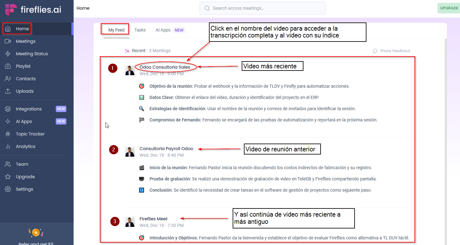 Para acceder a los detalles de la reunión y al video, haz click sobre el nombre de la reunión.