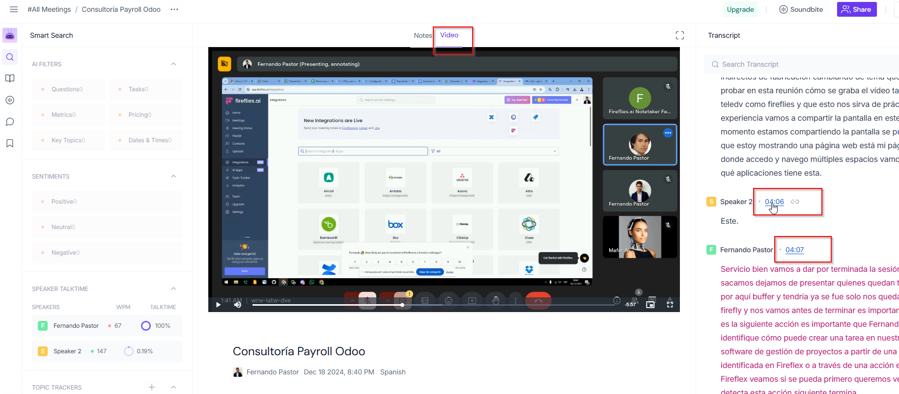 Si das click en "Video" podrás visualizar el video de la reunión y puedes navegar fácilmente por el video usando el resumen y los enlaces de tiempo