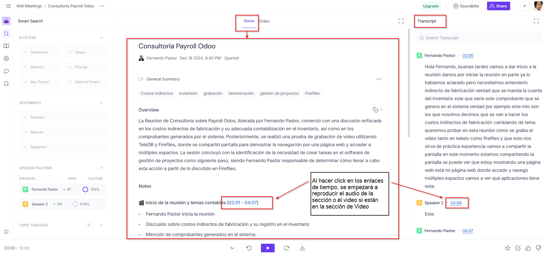 Si das click en los enlaces de tiempo, se reproducirá el audio de la reunión en el minuto específico seleccionado.