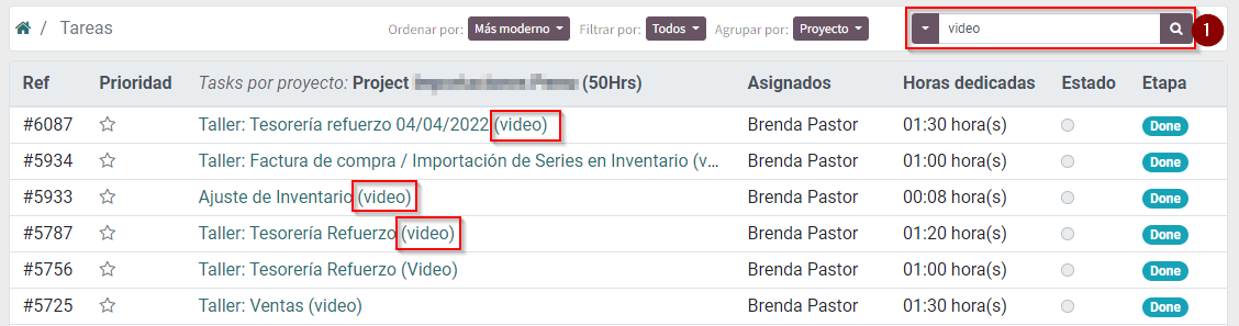 Accedes al listado de Tareas según el "Paso 2" y utilizas el buscador para filtrar la palabra "video". El Resultado de la búsqueda te mostrará las tareas que tienen el enlace de Descarga del video: