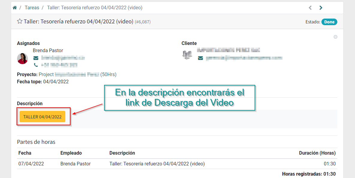 Ingresas a la tarea relacionada al video o sesión en vivo de Odoo, y en la descripción de la tarea está el enlace de Descarga del video.
